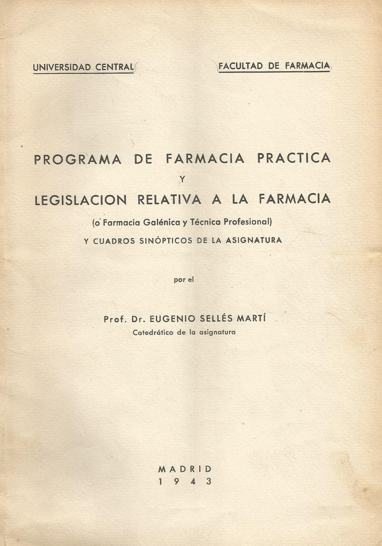 Libro de texto y formación,Medicina Programa de Farmacia Práctica y Legislación Relativa a la Farmacia (o Farmacia Galénica y Técnica Profesional) y Cuadros Sinópticos de la Asignatura – Eugenio Sellés Martí junio 26, 2015 librossargantana Estado: Bien Programa correspondiente a la asignatura Edita: Nuevas Gráficas. Madrid. 1943 Precio: 37,87 € COMPRAR Comparte esto: Haz clic para compartir en Facebook (Se abre en una ventana nueva) Facebook Haz clic para compartir en X (Se abre en una ventana nueva) X Me gusta Cargando... Relacionado